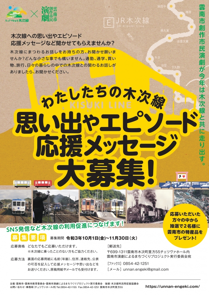 次作市民劇「木次線をモチーフにした作品(タイトル未定)」のキャスト・スタッフの募集を開始します。 皆様のご応募をお待ちしております。 -
